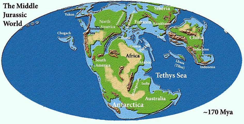 A jura időszakban a Földön nem voltak jégsapkák. A Szibériában és Alaszkában talált növény- és dinoszauruszfosszíliák alapján még a sarkvidékek környékén is enyhe volt az éghajlat. A tengerszint általában magas volt. Elkezdődött a Pangea szuperkontinens szétdarabolódása, és a ma ismert szárazföldek kialakulása.