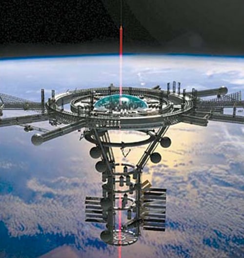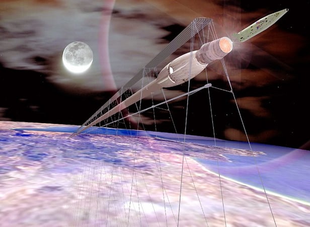 While there are a variety of designs, the key component of a working space elevator would be a thin tether made from lightweight material (carbon nanotubes are the prime candidate) that stretches from an anchor point or base station on or near the Earth’s equator to a point some 60,000 miles (96,560 km) into space. The Earth’s rotation and a counterweight on the upper end of the cable would keep the line taught and climbers (likely powered by solar energy) traveling at fast train pace would be sent up this futuristic beanstalk to deliver cargo and people into orbit and back.