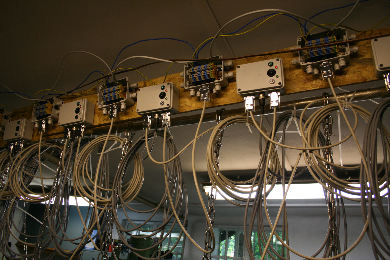 Az etető fejet és a haltáp tartályt két etetés közti szünetben mutatja, halházi; recirkulácós; biológiai szűrős; intenzív hal nevelő medencében. A halak fajtája volgai tok.