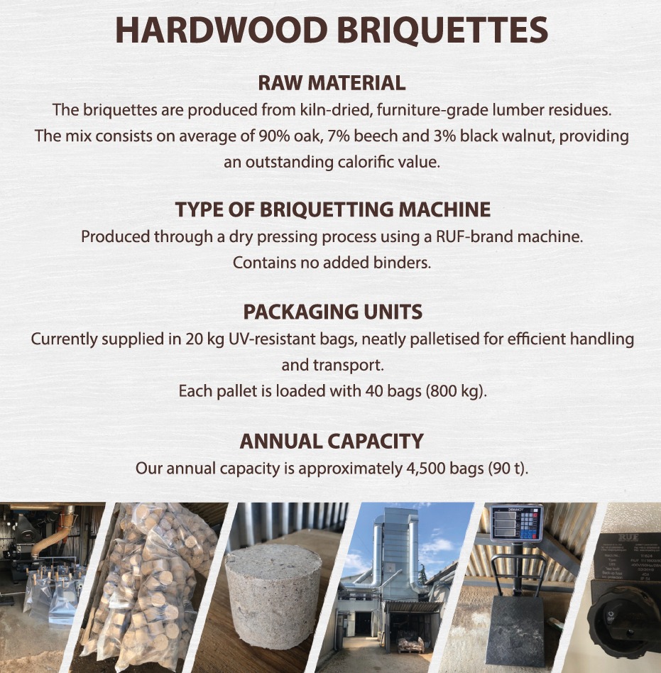 The briquettes are produced from kiln-dried, furniture-grade lumber residues.