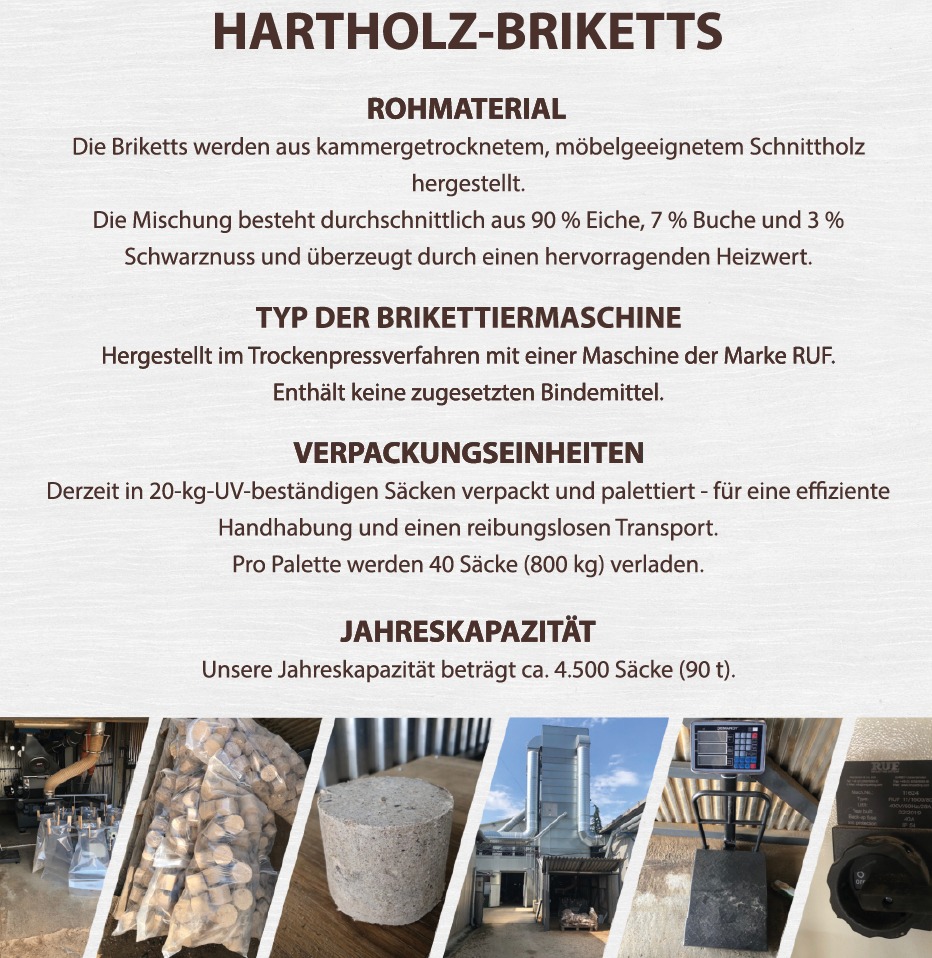 Die Briketts werden aus kammergetrocknetem, möbelgeeignetem Schnittholz hergestellt.